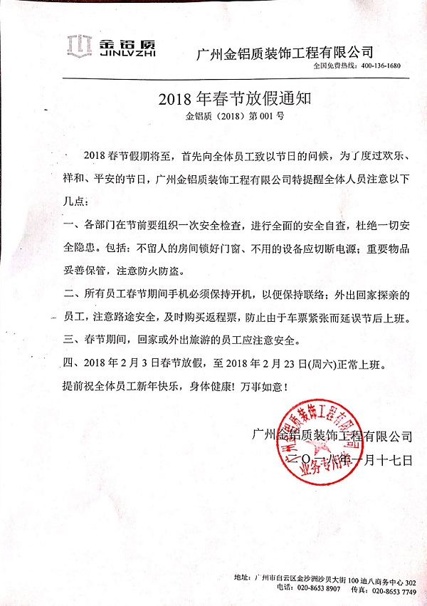 2018春節(jié)假期將至,首先向全體員工致以節(jié)日的問候,為了度過歡樂、祥和、平安的節(jié)日,廣州金鋁質(zhì)裝飾工程有限公司特提醒全體人員注意以下幾點: